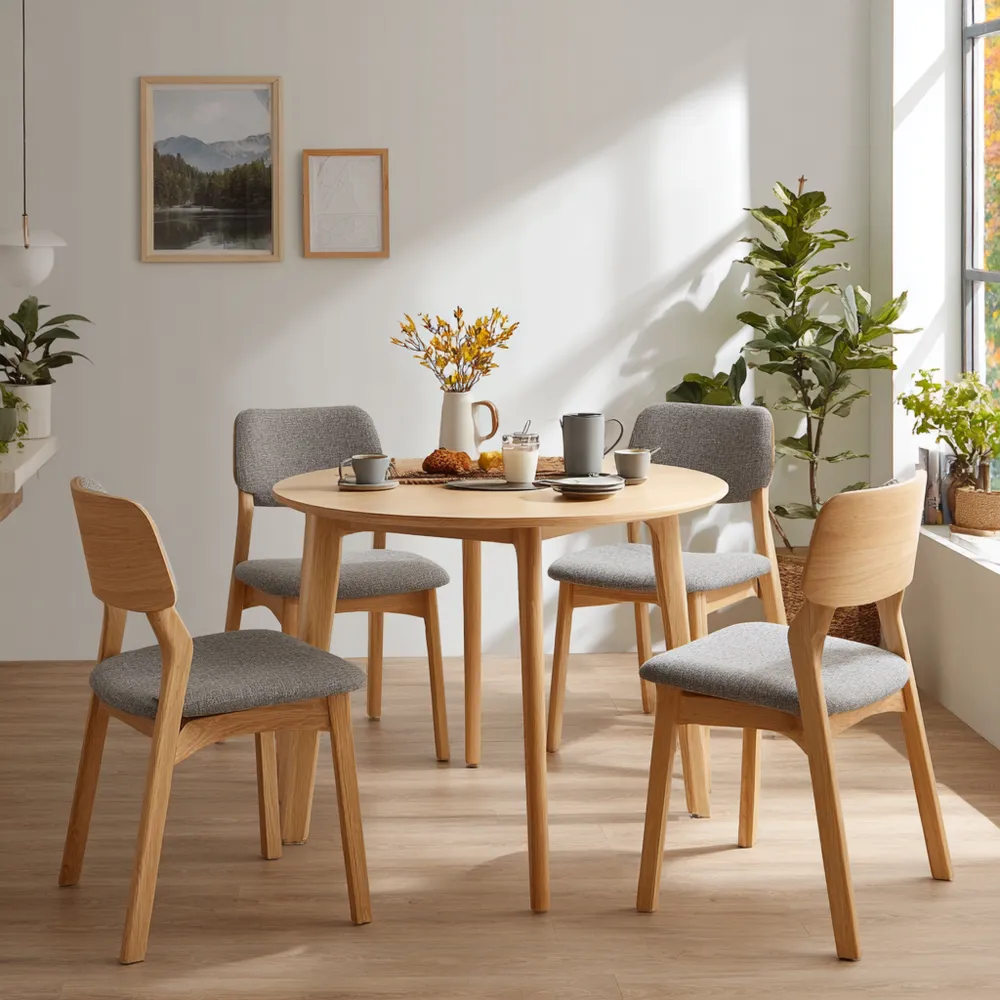 Set da pranzo compatto con tavolo rotondo e sedie imbottite